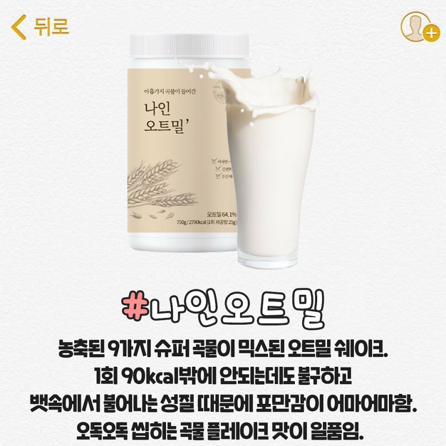 농축된 9가지 슈퍼 곡물이 믹스된 오트밀 쉐이크로 1회 90kcal밖에 안되는데도 불구하고 뱃속에서 불어나는 성질 때문에 포만감이 굉장한 장점