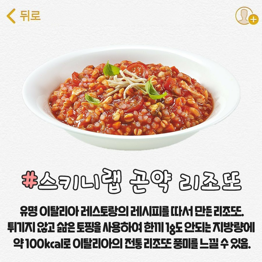 유명 이탈리아 레스토랑의 레시피를 따서 만든 리조또. 튀기지 않고 삶을 토핑을 사용하여 한끼 1g도 안되는 지방량에 약 100kcal로 이탈리아의 전통 리조또의 풍미의 신세계를 느낄 수 있다.