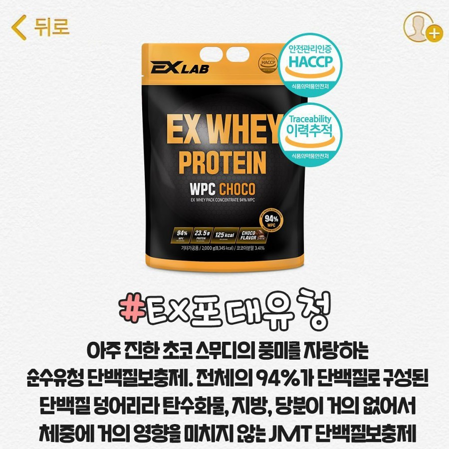 아주 진한 초코 스무디의 풍미를 자랑한다. 순수유청 단백질 보충제. 전체의 94%가 단백질로 구성된 단백질 덩어리라 탄수화물, 지방, 당분이 거의 없어서 체중에 거의 영향을 미치지 않는 JMT 단백질 보충제