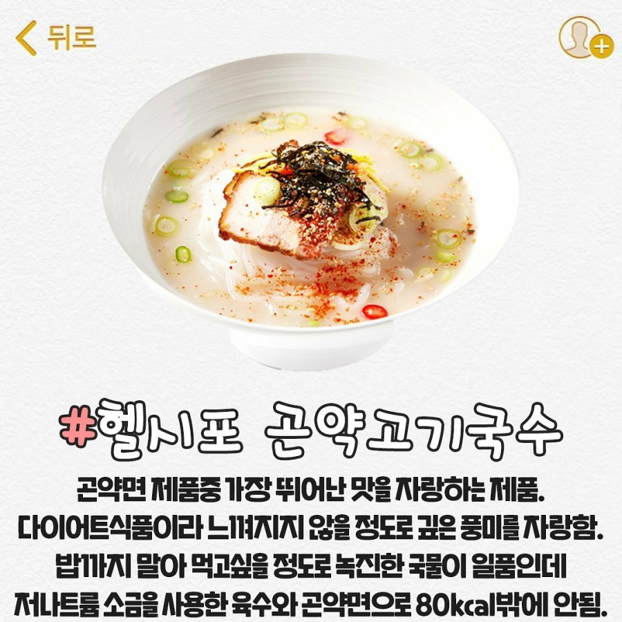 곤약면 제품 중 가장 뛰어난 맛을 자랑하는 제품. 다이어트 식품이라 느껴지지 않을 정도로 풍미가 뛰어나다. 밥까지 말아 먹고 싶을 정도로 진한 국물이 일품인데 저나트륨 소금을 사용한 육수와 곤약면으로 무려 80kcal 밖에 안된다.