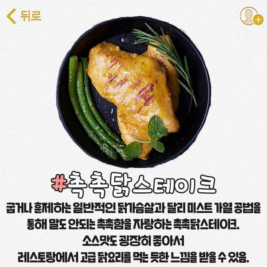 굽거나 훈제하는 일반적인 닭 가슴살과 달리 미스트 가열 공법을 통해 말도 안되는 촉촉함을 자랑하는 촉촉닭스테이크~ 소스맛도 굉장히 좋아서 레스토랑에서 고급 닭요리를 먹는 듯한 느낌을 받을 수 있다.