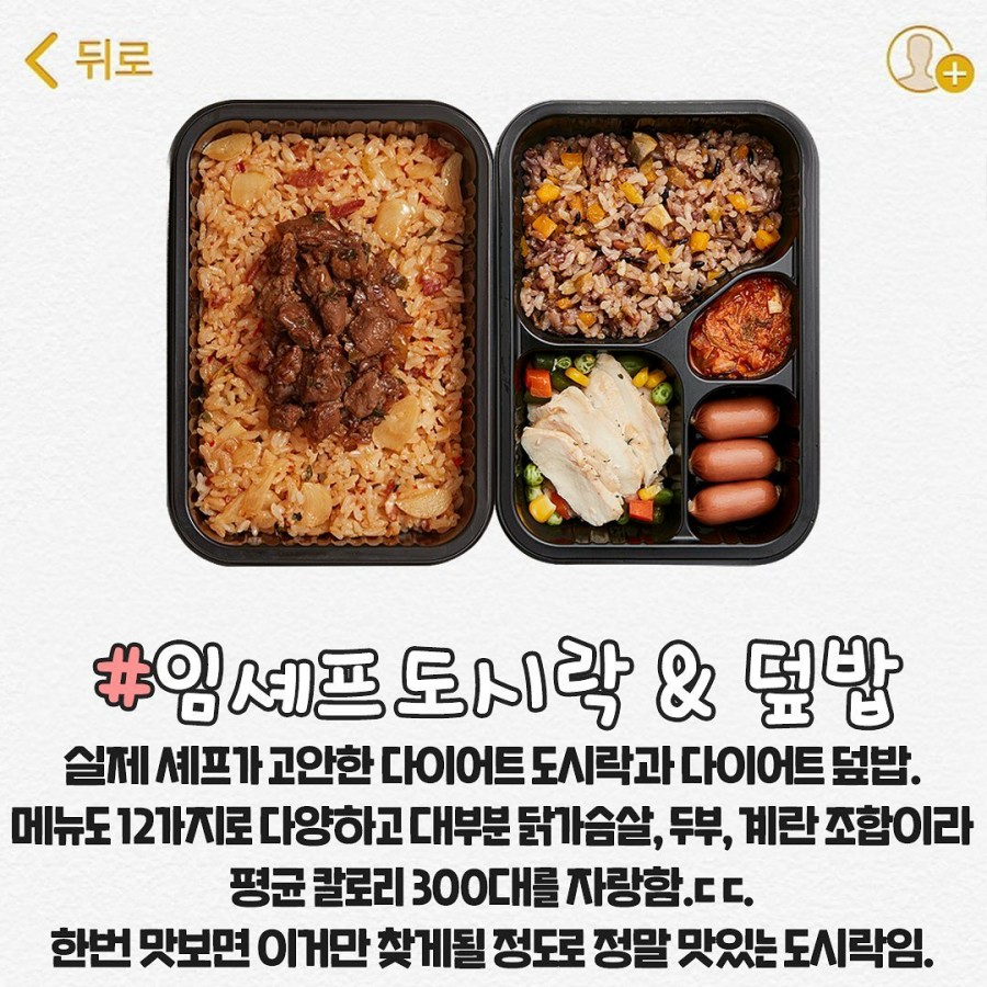 실제 셰프가 고안했다는 다이어트 도시락과 다이어트 덮밥, 메뉴도 12가지나 되서 다양하고 대부분 #닭가슴살, #두부, #계란 조합이라 평균 #칼로리 300대를 자랑한다. 한 번 맛보면 계속 찾게 될 정도로 맛이 뛰어나다는 평이 많다.
