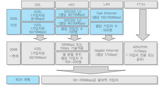 은 ADSL/VDSL 기술을 사용하는 전화선과 케이블 TV 망을 이용하는 HFC망 그리고