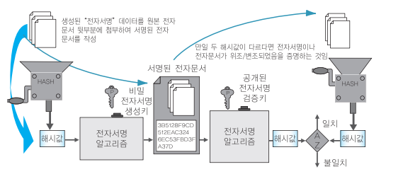 해 전송한다. 수신측에서는 수신된 데이터를 전자서명 알고리즘을 통해 공개된 전자서명을 검증 한 후, 해시 함수를 통과시켜 불일치 할 경우에는 전자서명이나 전자문서가