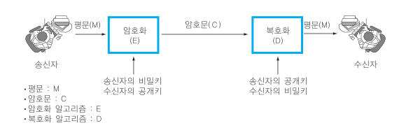 호화 알고리즘과 암호 키를 이용하여 평문을 암호문으로 변환하여 전송하고, 수신측에