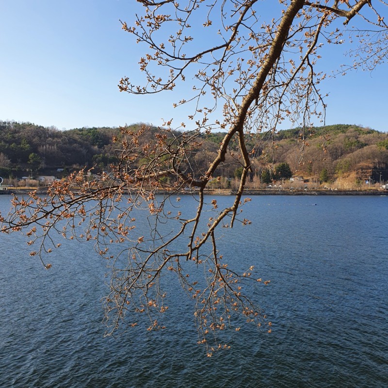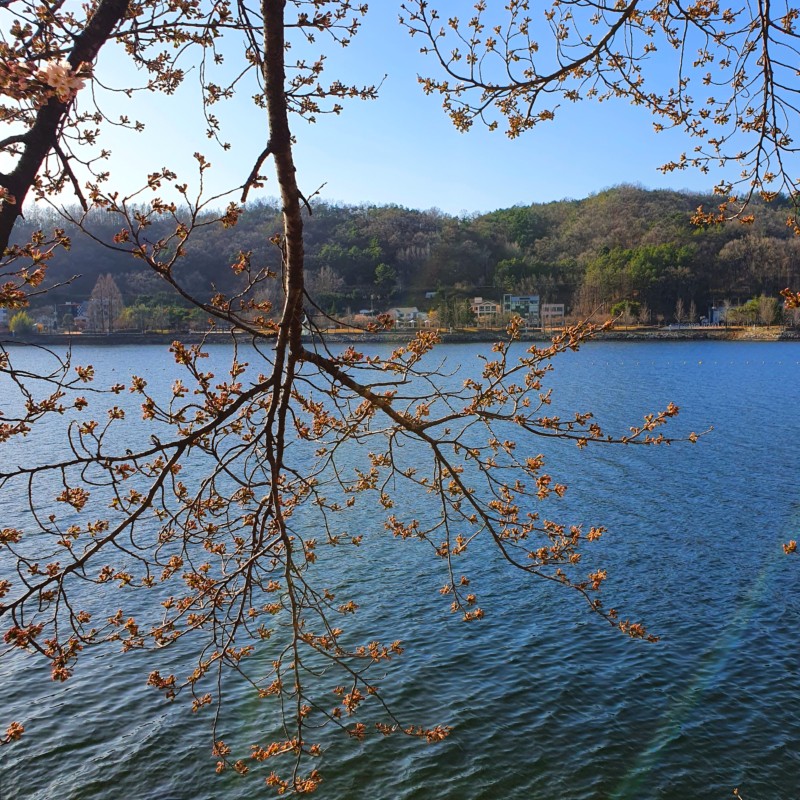 바로 잔잔한 물 위로 뻗은 벚꽃 가지들 때문인데