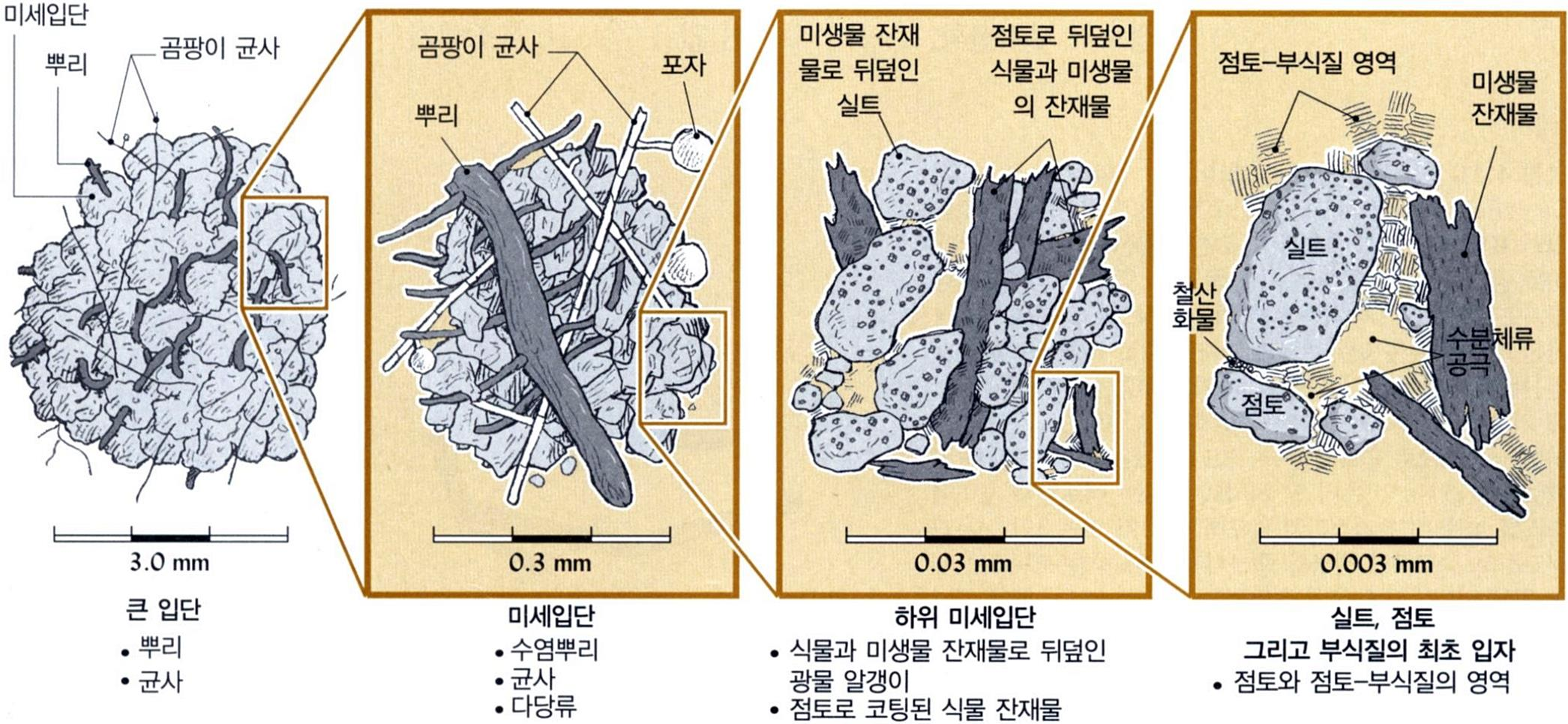 ► 토양생물, 식물뿌리의 생장과 부패 ► 점토 및 토양산화물의 피복상태