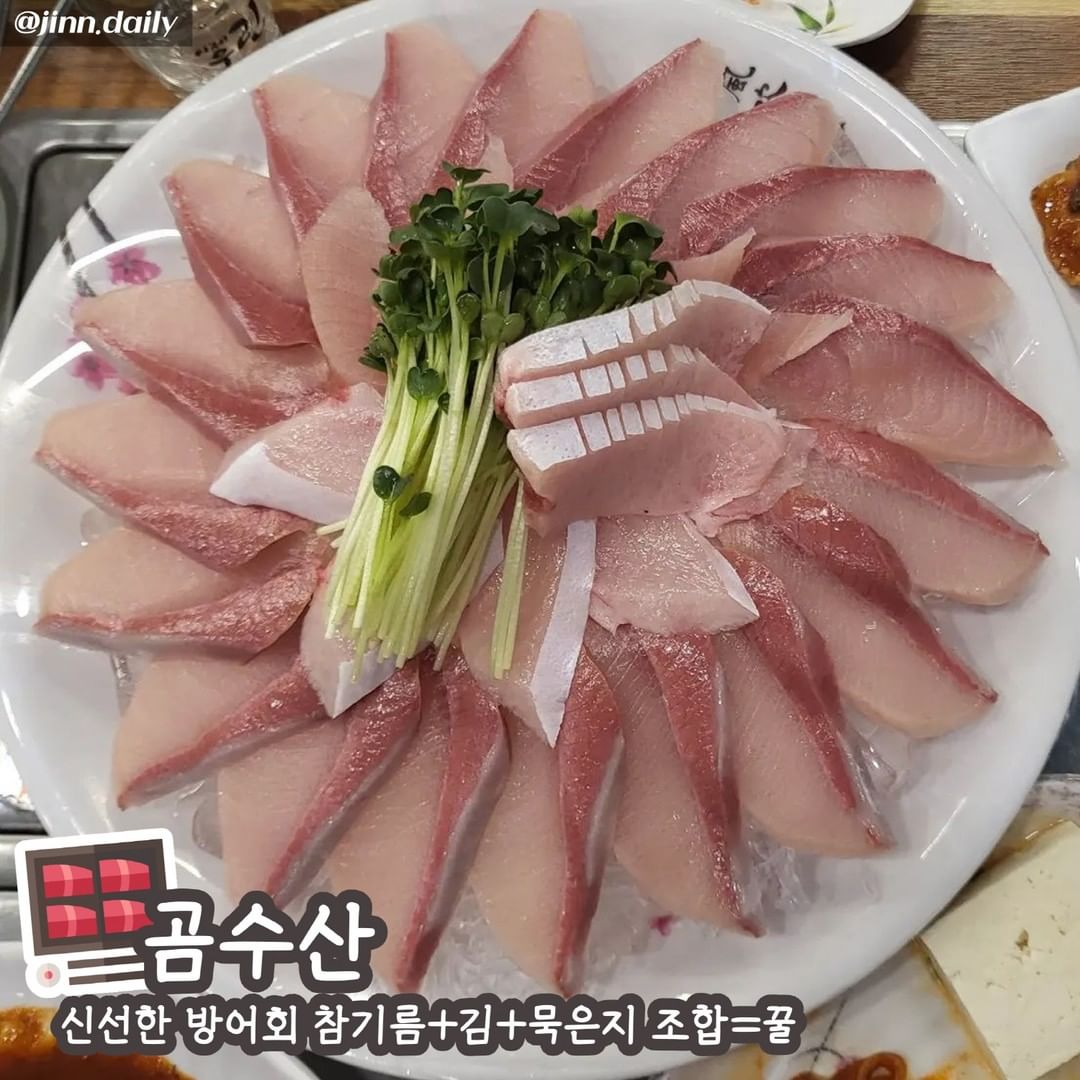신선한 방어회 참기름 + 김 + 묵은지의 꿀조합